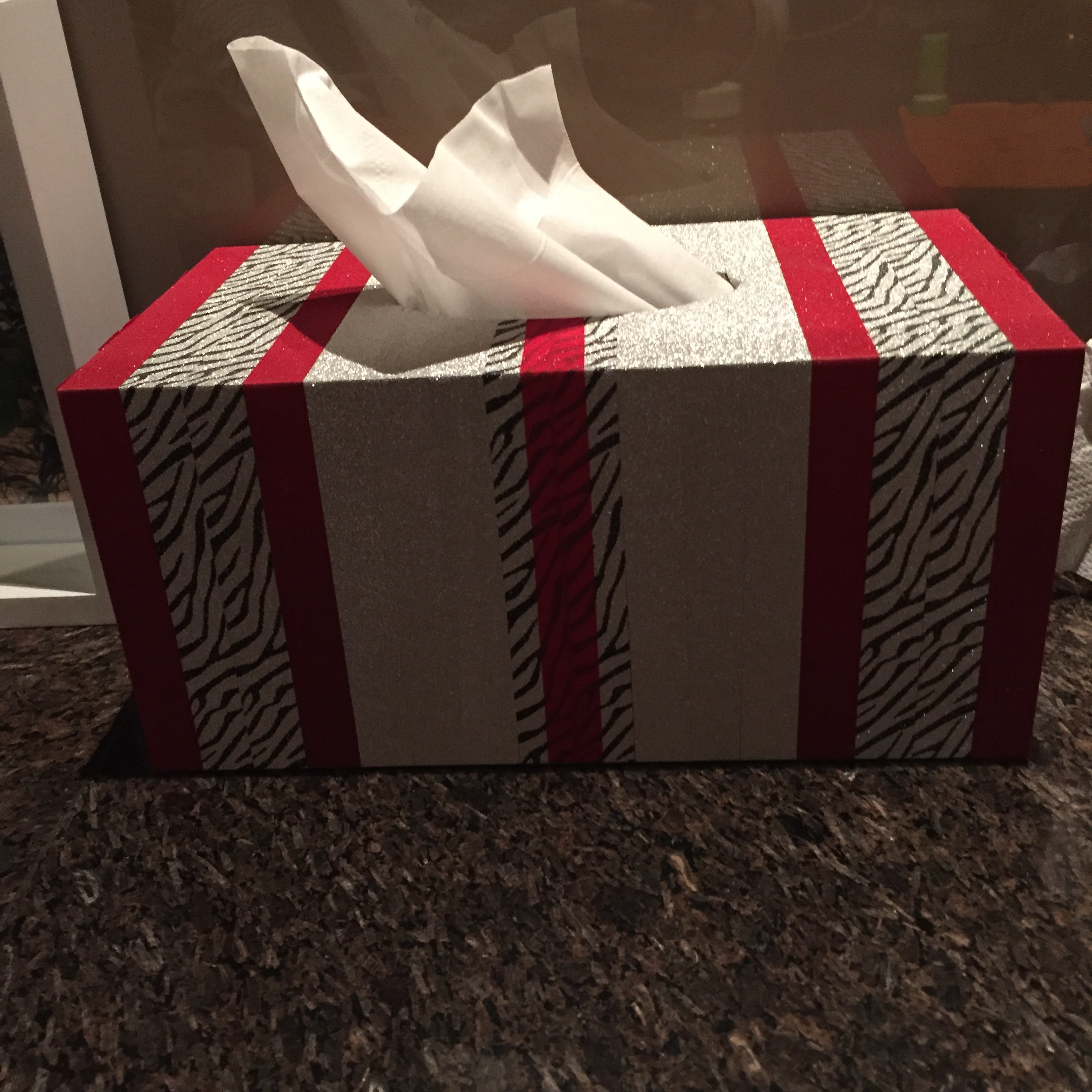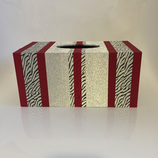 (I have a mostly white-walled house with splashes of red in accessories here and there, with stainless steel appliances in the kitchen. I’m loving the red/silver sparkly combo! This is the only touch of “bling” in the house, and a tissue box is small enough I think the bling can stay!)
