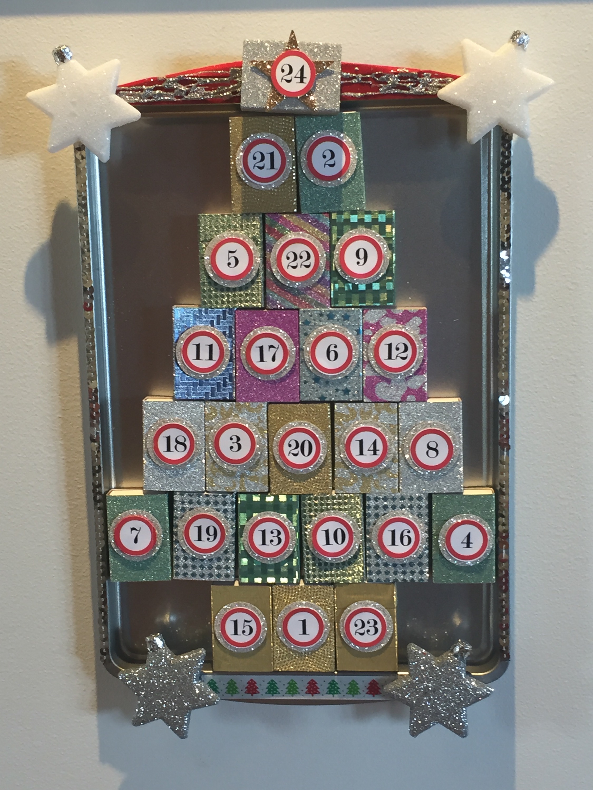 This is made with match boxes, a baking tray, magnets and glitter Washi tape to cover the boxes. I also grabbed a few Christmas decorations to stick on the edge. (And nothing but super glue worked to stick those suckers onto the metal!)
