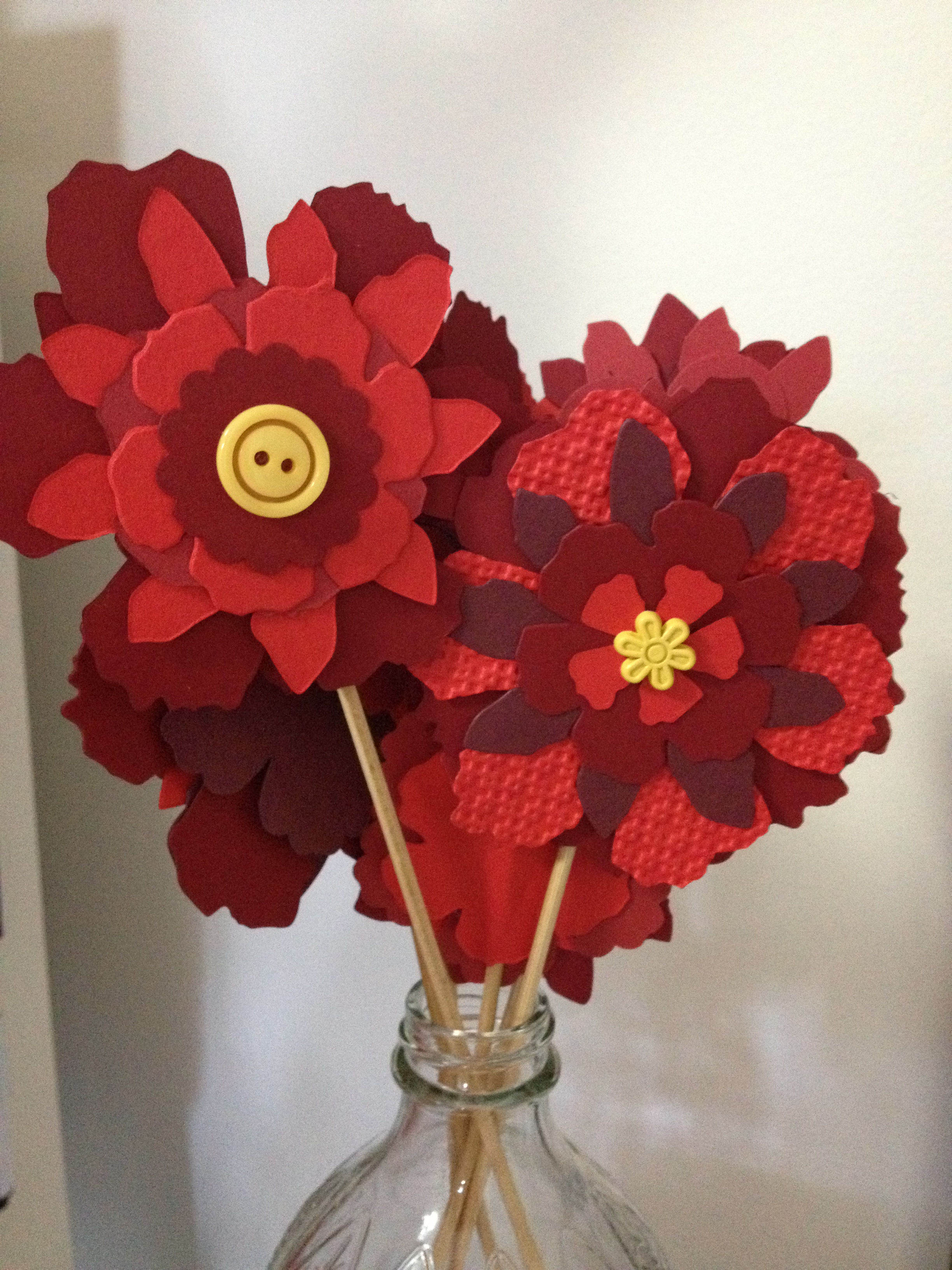 We used a variety of Stampin’ Up! punches – Blossom, Fancy Flower, Boho Blossoms, and various scallop and circle punches as well as some die cut flowers.   Stick them all together with glue and dimensionals to make flowers, and finish off with a button or brad in the centre.   We used Riding Hood Red, Cherry Cobbler, Bravo Burgundy and Poppy Parade (retired) card stock.