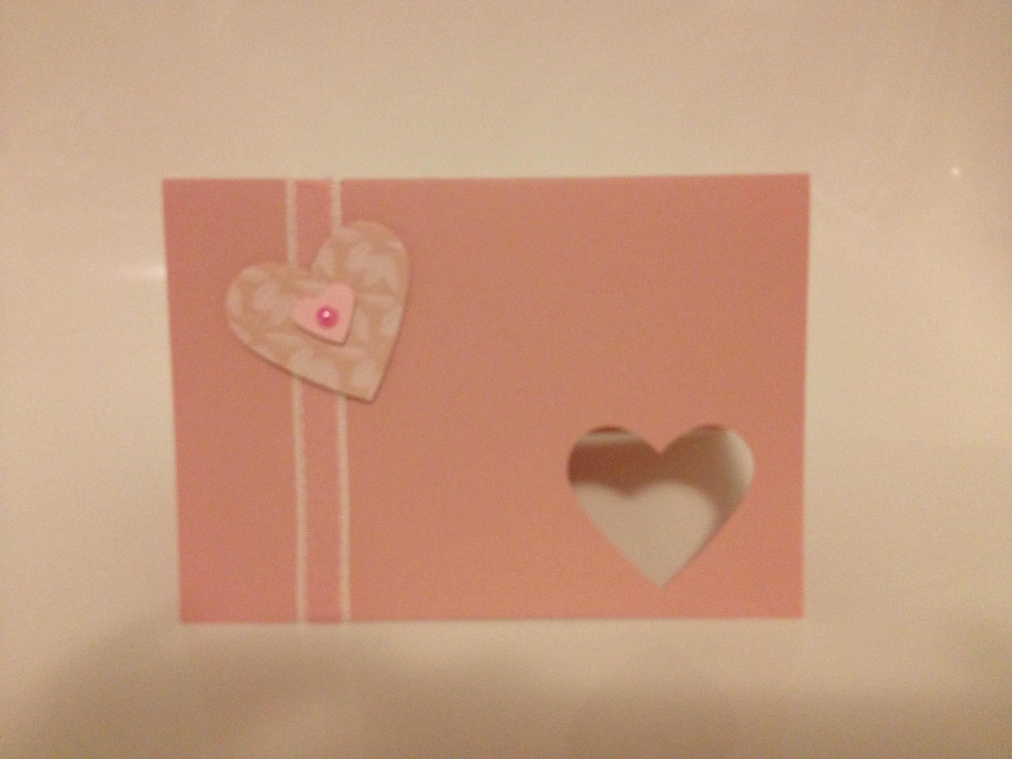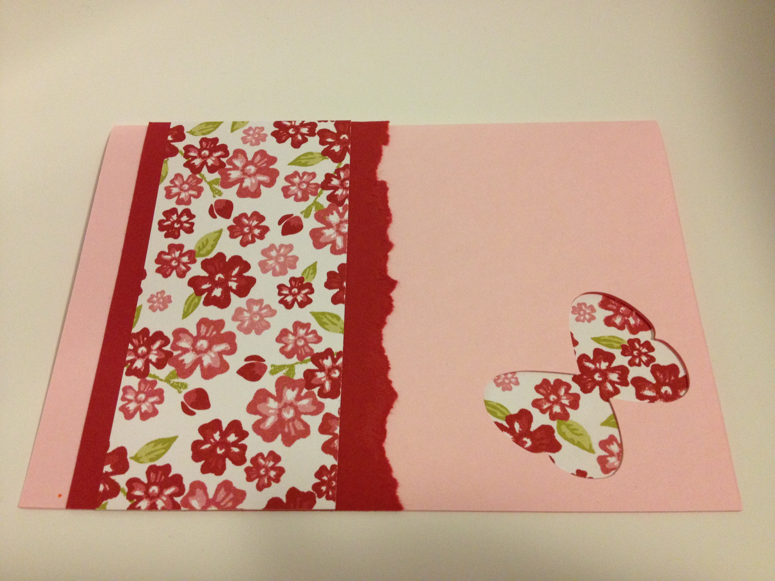 You can see I’ve cut a heart out of the front of the card and then another heart out of designer series paper. (Don’t throw the card stock away!). Stick the designer paper heart on the inside of the card and it makes a heart shaped “window” which can look really effective for a simple card.